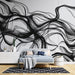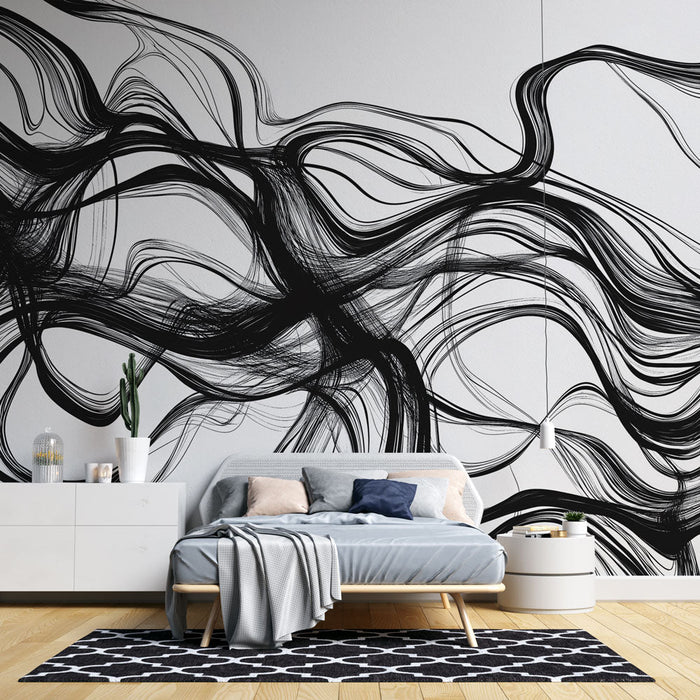 This mural wallpaper features a captivating abstract design, composed of fluid lines in black on a bright white background. The curves and interlaces create a dynamic effect, bringing artistic depth to any room.