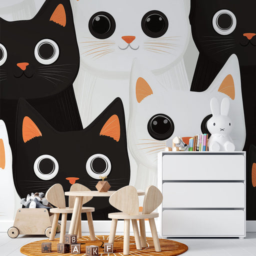 The colors that will complement this mural wallpaper include vibrant shades like yellow and orange, or softer tones like light gray, to create a harmonious atmosphere while highlighting the cat motif.