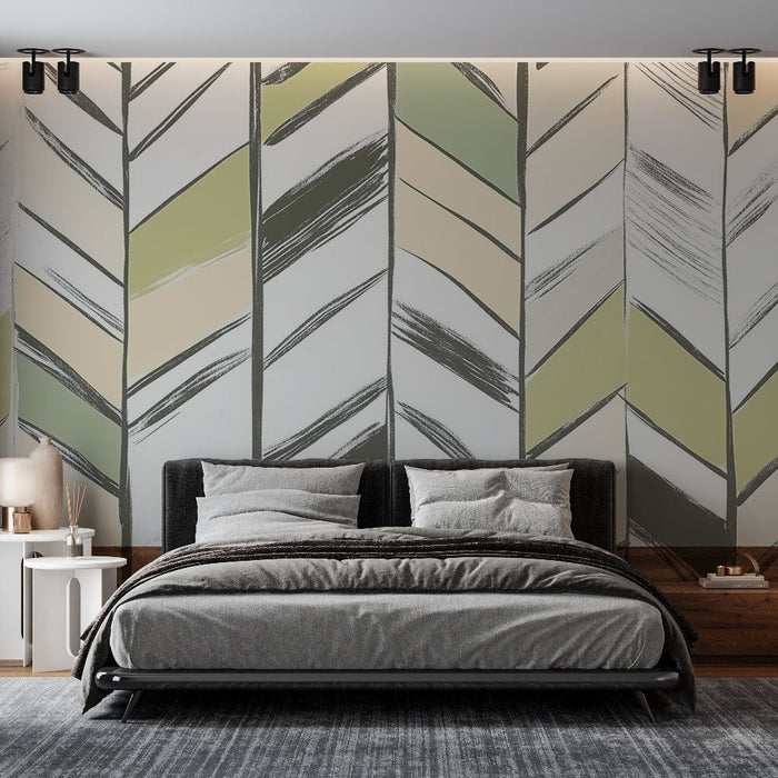 Transform your space with our mural wallpaper chevrons, featuring a modern geometric pattern with soothing pastel tones of green and beige. This elegant and subtle design is perfect for adding a contemporary and sophisticated touch to any room in your home.