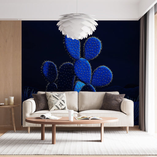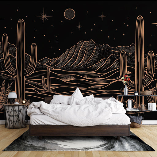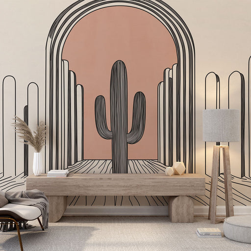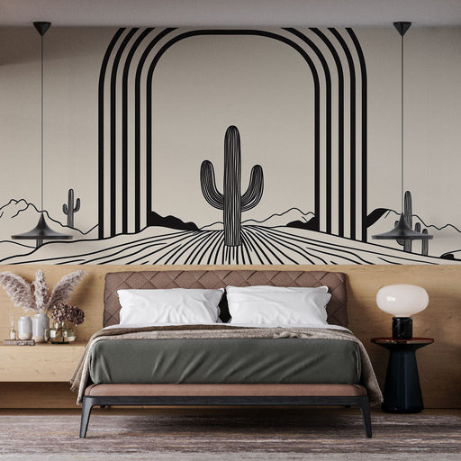 This mural wallpaper evokes a captivating desert landscape, featuring a majestic cactus in the foreground, surrounded by dry vegetation and hills in the background. The warm and natural shades of beige and green create a serene and peaceful atmosphere, ideal for creating a calming space.