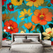 Add a touch of liveliness to your interior with our Mural Wallpaper floral, featuring vibrant flowers in red, orange, and yellow tones on a bright turquoise background. This bold and colorful design is perfect for brightening up any room, whether it's the living room, bedroom, or a creative space.