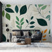 This mural wallpaper features a refined design composed of stylized leaves, presented in a color palette ranging from green to beige, with delicate touches of yellow and orange. The refined lines and curves of the leaves add a modern and artistic touch to your interior decoration.