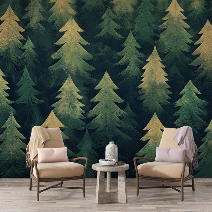 This mural wallpaper features a magnificent pattern of conifers, highlighting carefully drawn fir trees with shades of green and gold. The dark background enhances the beauty of the trees, creating a soothing and enveloping atmosphere.