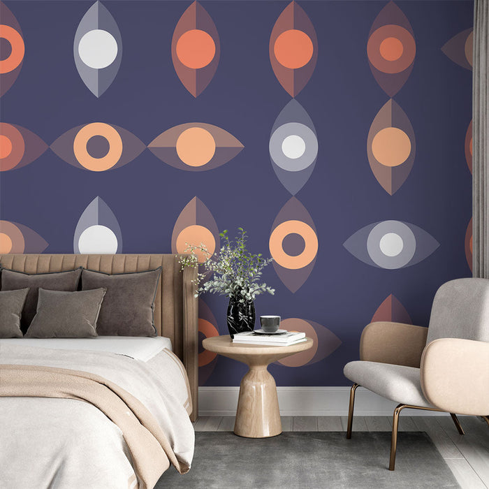Bring your walls to life with our geometric mural wallpaper featuring an abstract pattern of colorful eyes. The oval shapes and circles in harmonious pastel tones stand out elegantly against a deep purple background, creating a captivating and original visual effect.