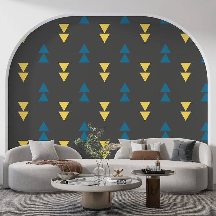 Add a modern and stylish touch to your interior with our geometric mural wallpaper featuring arrow patterns in yellow and blue on a dark gray background. Ideal for a contemporary living room or a teenager's bedroom, this bold and dynamic design will bring vibrancy and energy to any room.