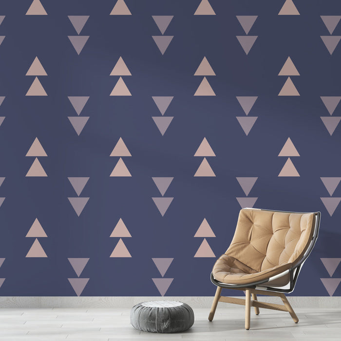 Decorate your interior with our geometric mural wallpaper featuring triangle patterns in soothing shades of pink and purple. Perfect for a modern living room or a child's bedroom, this pattern adds a touch of structure and style thanks to its repetitive and harmonious design.