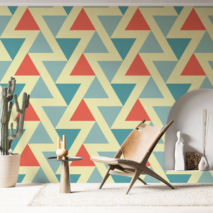 Transform your space with our Mural Wallpaper geometric with retro triangle patterns. Its vibrant colors of coral red, teal blue, and beige create a dynamic and modern atmosphere. Perfect for adding character to your living room or office.