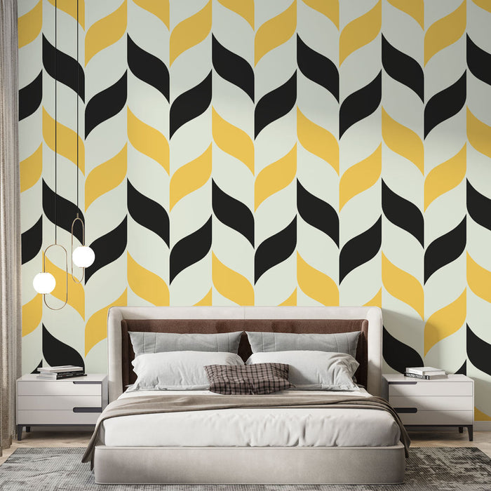 This geometric mural wallpaper features a retro pattern in yellow, black, and white, perfect for adding a vintage and dynamic touch to your interior. The curved and repetitive shapes offer a bold design for captivating wall decoration.