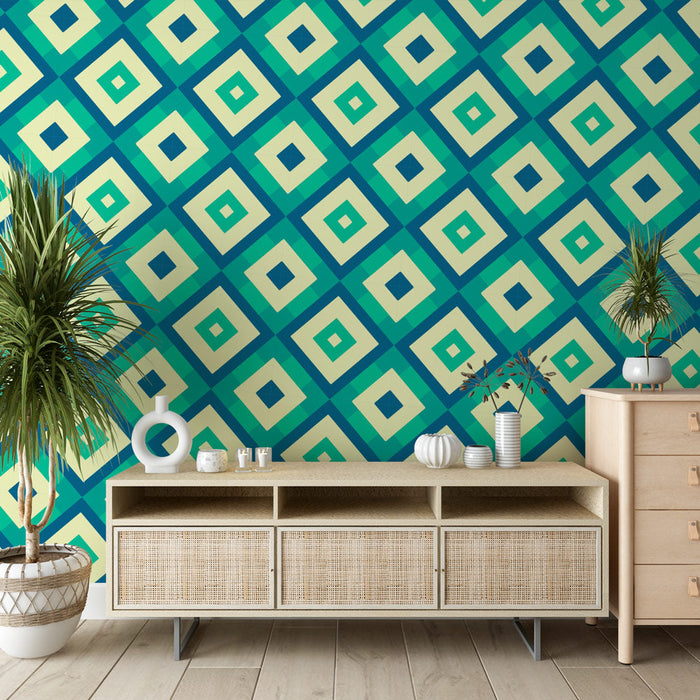 Transform your space with our geometric mural wallpaper featuring interwoven square patterns in blue and green. This dynamic design brings a modern and vibrant touch to any room.