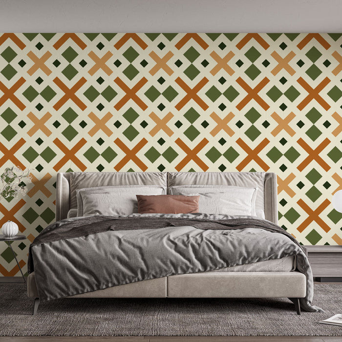 This vintage geometric mural wallpaper features a captivating retro pattern combining geometric shapes in olive green and orange. Perfect for adding a nostalgic and stylish touch to your interior, it pairs ideally with 70s-inspired decor.