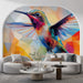 This captivating mural wallpaper features a stylized hummingbird in a contemporary geometric design, showcasing a vibrant color palette ranging from deep reds to sunny yellows. The colorful facets create a sense of movement and energy, bringing a unique dynamic to your space.