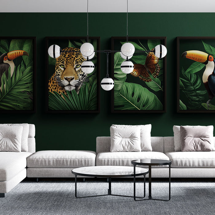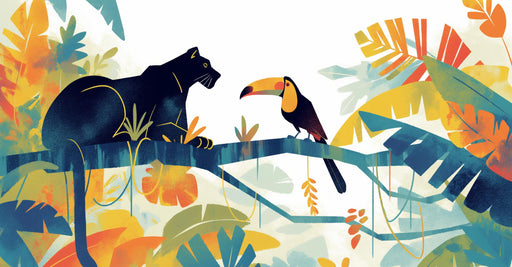 Discover our Mural Wallpaper inspired by the tropical world, featuring exotic animals such as toucans, a jaguar, and a butterfly, all bathed in rich green foliage. The vibrant and detailed illustrations bring a wild and natural touch to your space, transforming a wall into a true work of art.