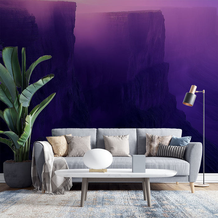 Discover our mural wallpaper depicting a landscape of imposing cliffs, bathed in a dreamlike atmosphere of purple hues and light mist. This unique design evokes distant landscapes, creating a sense of escape and mystery, perfect for bringing a soothing aura to your interior.