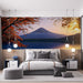 Discover our mural wallpaper mountain landscape capturing a magnificent sunset over a peaceful lake, dominated by a majestic mountain in the background. The red and orange autumn leaves add a touch of warmth and serenity to your interior space.