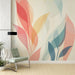 This mural wallpaper features a delicate pattern of overlapping leaves, evoking a light dance of pastel colors. The soft shades of coral, blue, yellow, and green blend harmoniously, creating a soothing and warm atmosphere. The subtle texture of the leaves adds a touch of depth while remaining fluid and airy.