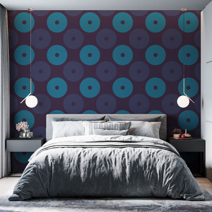 Discover our retro mural wallpaper with blue and purple circle patterns, ideal for bringing a vintage and original touch to your interior. The contrasting shades of blue and purple create a captivating visual effect, perfect for energizing a living room or bedroom.