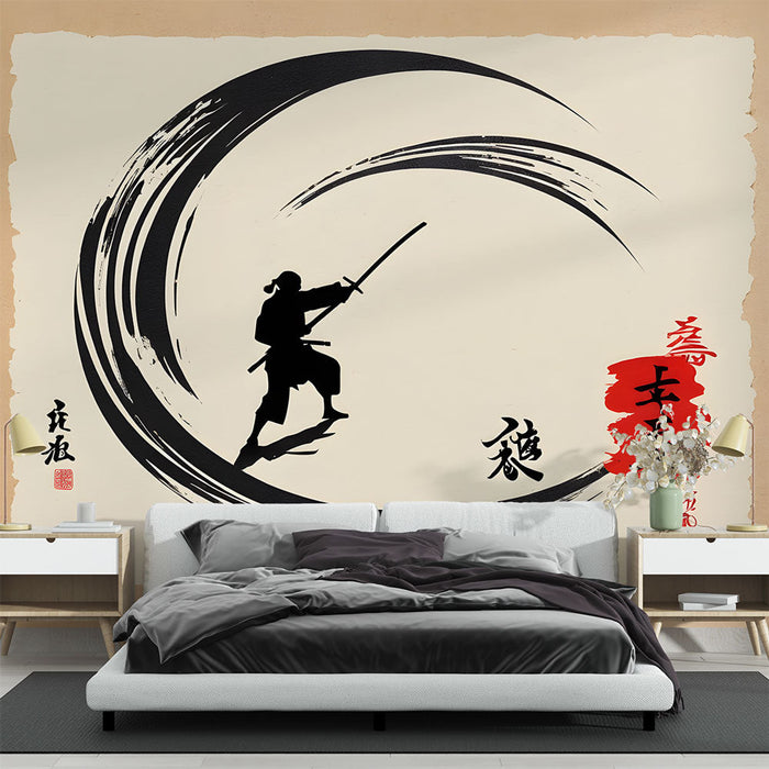 Discover our samurai mural wallpaper, an elegant work of art that captures the essence of the legendary Japanese warrior. The black silhouette of a samurai in full action is highlighted by bold brush strokes, symbolizing movement and mastery.