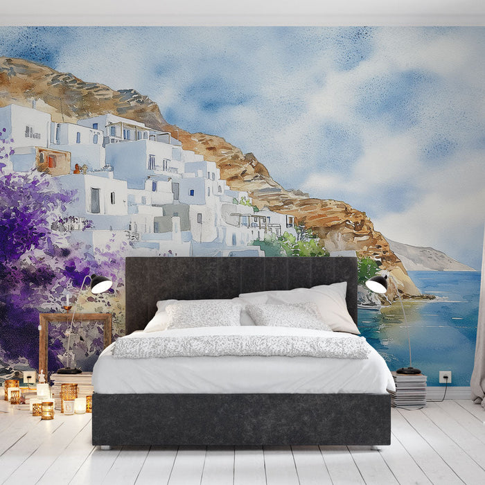 This mural wallpaper evokes an enchanting coastal scene, depicting white houses overlooking a turquoise sea, surrounded by greenery and purple flowers. The soft shades and watercolor details create a peaceful and relaxing atmosphere, ideal for bringing a Mediterranean touch to your interior.