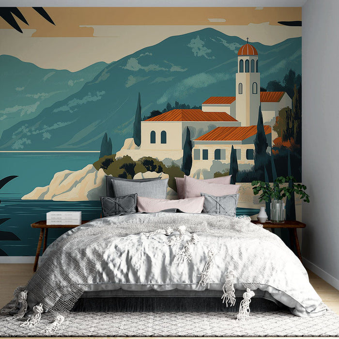 This mural wallpaper reveals an enchanting Mediterranean landscape, featuring a charming villa perched on the coast. The warm and soothing colors evoke the relaxing atmosphere of summer vacations, while the mountains in the background add a touch of natural grandeur.