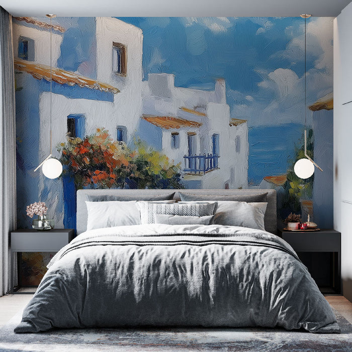 This mural wallpaper evokes a charming Mediterranean street, adorned with white houses and vibrant flowers. The bright walls and azure sky create an atmosphere that is both soothing and invigorating, perfect for bringing a touch of sunshine into your home.