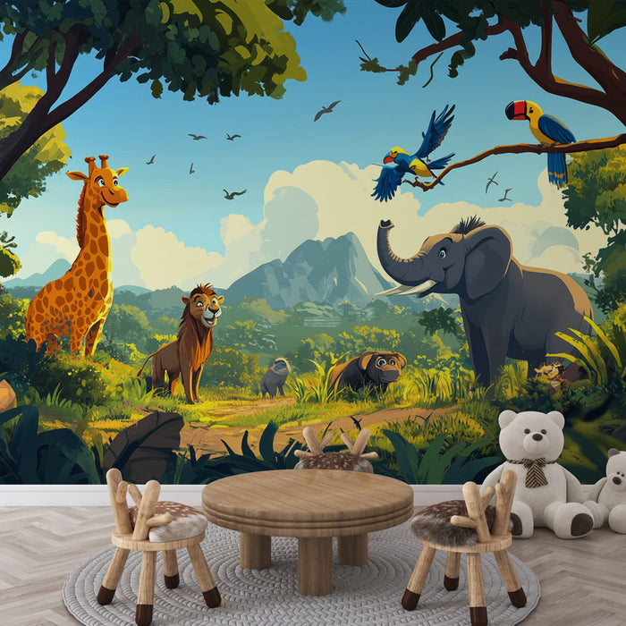 Decorate your child's room with this Animated Savannah Mural Wallpaper, featuring a colorful set of exotic animals such as a giraffe, a lion, an elephant, and tropical birds. This vibrant design transforms any room into a playful and adventurous space. The bright colors and jungle details add a touch of magic to your interior, inviting exploration and discovery.
