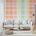 This plaid mural wallpaper features a combination of soft pastel colors, including mint green, pale yellow, and salmon pink, creating a soothing and welcoming atmosphere. The fine white lines running through this pattern add a touch of freshness while maintaining a subtle balance between tradition and modernity.