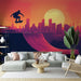 This vibrant mural wallpaper captures the energy of skateboarding with a skateboarder in mid-jump, soaring over a ramp in a metropolitan city at the golden hour of dusk. Warm and bright colors dominate, creating a dynamic and urban atmosphere.