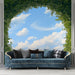 This mural wallpaper evokes a soothing perspective of nature, featuring a frame of dense foliage that encircles a light blue sky dotted with soft clouds. The various shades of green in the leaves add depth and richness, creating a fresh and serene atmosphere suitable for any type of interior.