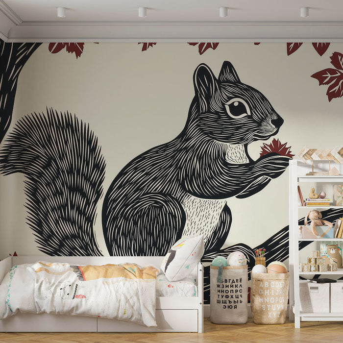 This mural wallpaper highlights a squirrel in a graphic style, its detailed and expressive fur standing out against a light background. It holds a leaf in its paws, adding a dynamic touch to the scene. The red leaves surrounding it evoke the beauty of autumn landscapes, bringing a warm and welcoming atmosphere to your interior.