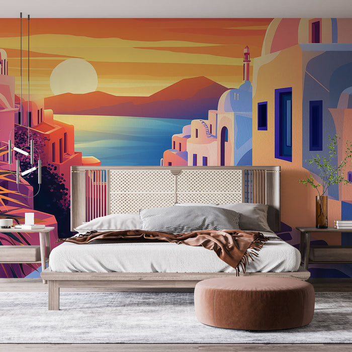 Discover our vibrant mural wallpaper depicting a sunset in Santorini. This colorful design captures the beauty of a peaceful evening, where whitewashed houses blend with shades of purple and orange in a Mediterranean landscape.
