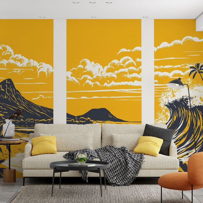 This mural wallpaper represents a stunning tropical landscape with dynamic maritime elements, on a bright yellow background. The illustrations evoke majestic mountains, powerful waves, and palm trees, creating a summery and sunny atmosphere.