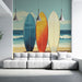 The WonderMural.com tip: For maximum impact, apply this mural wallpaper on an accent wall while keeping the other surfaces neutral, allowing the vibrant colors of the surfboards to fully express themselves.