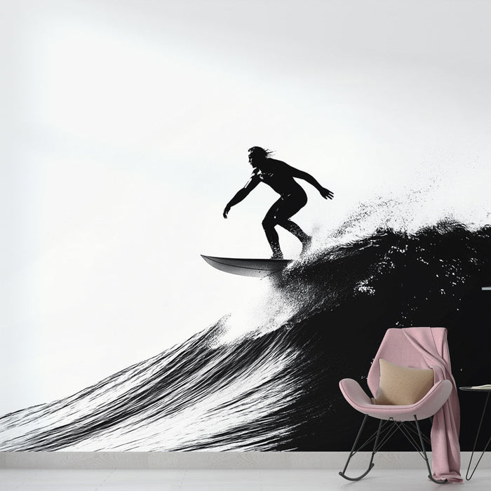 This captivating mural wallpaper highlights the dynamic silhouette of a surfer taking on a majestic black wave. The contrast between the surfer and the minimalist background creates an atmosphere that is both energetic and soothing, perfect for thrill-seekers and lovers of clean aesthetics.