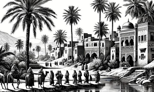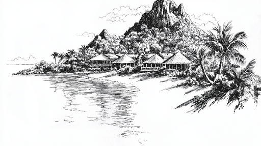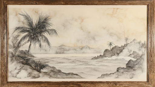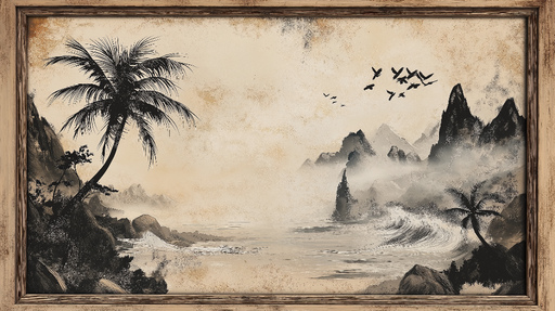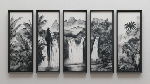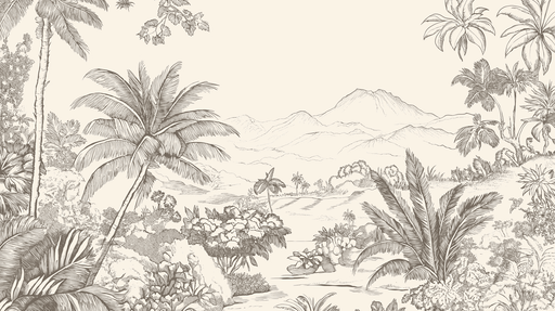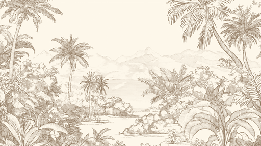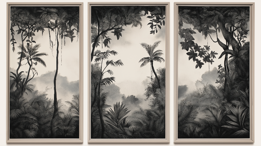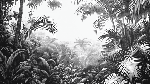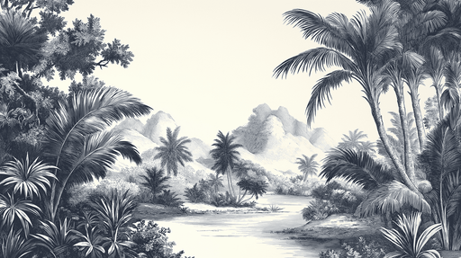 This wallpaper evokes a lush jungle landscape, rendered in an elegant black and white style. Detailed illustrations of palm trees and rivers create a soothing and wild ambiance, ideal for adding an artistic touch to your interior. The dark frames around the delicate scenes add an extra dimension, making this wallpaper a true statement in any room.