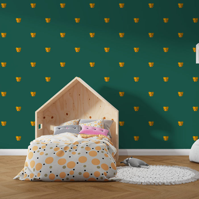 Add a playful and contemporary touch to your interior with our tiger mural wallpaper. This model features a pattern of small bright orange tiger heads scattered on a deep green background, creating a striking and modern contrast.