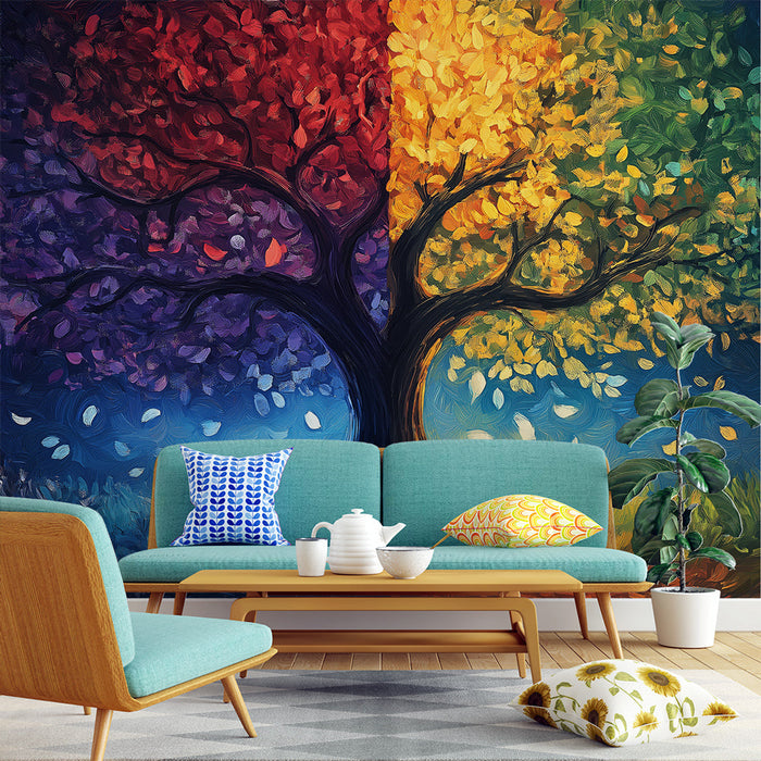 This captivating mural wallpaper features a tree of the seasons, divided into two colorful halves representing summer and winter. On the left, shades of red, purple, and blue evoke the cold winter evenings, while on the right, yellow, green, and orange hues celebrate the warmth of summer. The art evokes natural beauty and transformation, perfect for bringing an artistic touch to your interior.