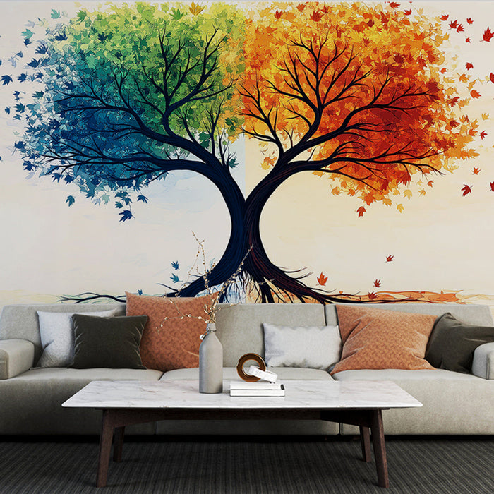 This captivating mural wallpaper features an artistic illustration of a majestic tree, divided between shades of green, orange, and red, symbolizing the transitions of the seasons. The flying leaves add a dynamic and light touch, making this decor perfect for bringing warmth and life to any space.
