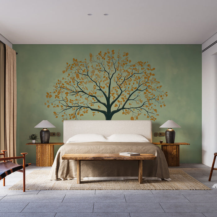 This mural wallpaper features a magnificent tree with golden leaves, with elegant branches extending upwards. The pastel green background adds a touch of serenity, while the golden leaves evoke the warmth of autumn. This harmonious design integrates perfectly into various decoration styles.