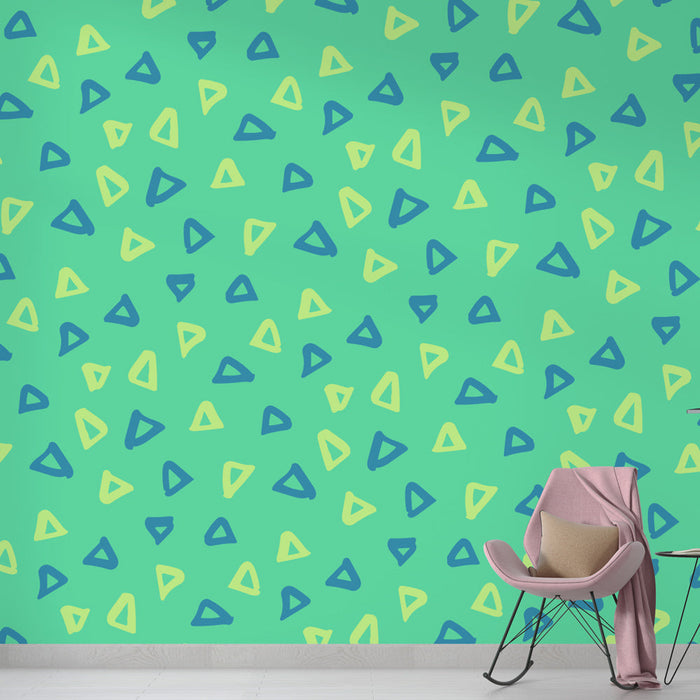 Bring a touch of freshness and modernity to your space with our mural wallpaper triangles. This graphic design features triangular shapes in shades of blue and green, ideal for a dynamic and contemporary interior.
