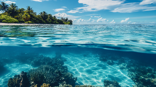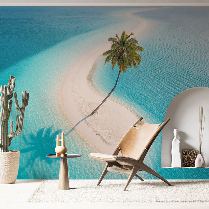 Discover a true tropical paradise with this captivating image of a deserted island surrounded by the turquoise and clear waters of the ocean. A palm tree stands majestically at the top of a fine sandy beach, casting its shadow on the sparkling water. This scene evokes serenity and escape, ideal for beautifying an interior or creating a relaxing atmosphere.