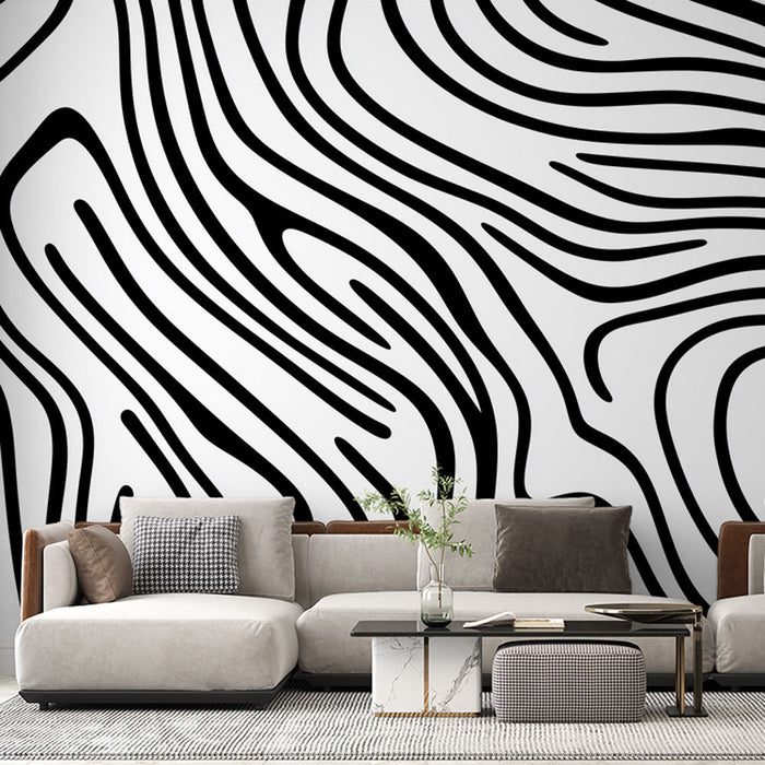 This mural wallpaper features an abstract black and white design, with fluid undulations that evoke an organic and dynamic movement. The sinuous lines intertwine and cross to create a captivating visual texture, bringing a modern and artistic effect to any room.