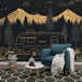 Discover our mural wallpaper inspired by camping, featuring a vintage caravan amidst a majestic forest, surrounded by imposing mountains and a starry sky. The golden lines on a black background add a touch of sophistication while evoking escape and adventure in the great outdoors.