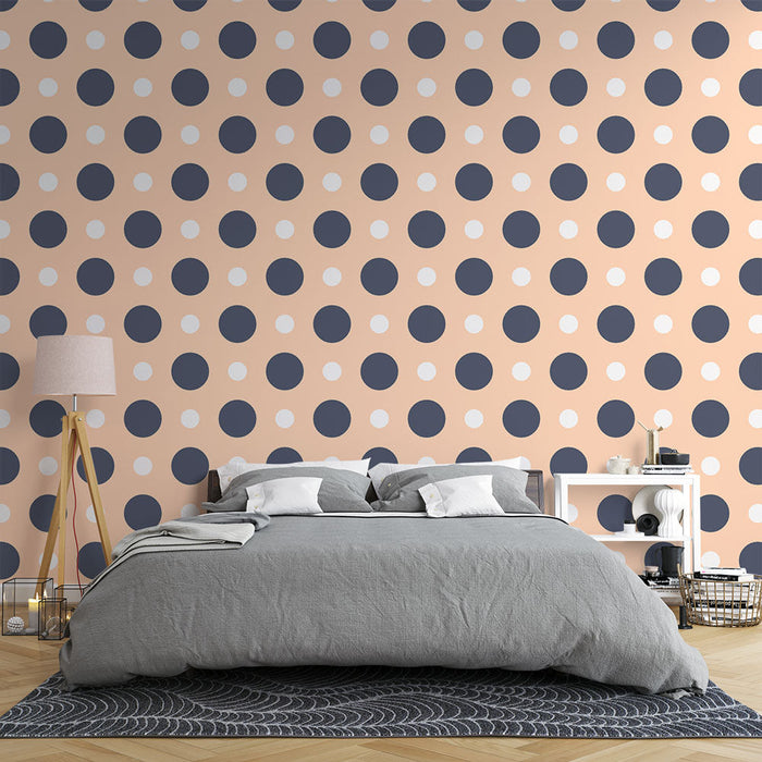 This mural wallpaper with polka dots features a charming retro pattern with navy blue and cream dots. Ideal for bringing a vintage touch to your interior decor, it fits perfectly in a bedroom or living room. This classic and playful design adds a note of elegance and softness to any space.
