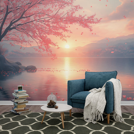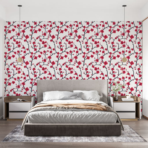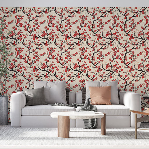 If you want to add a touch of grace and harmony to your interior, our Sakura wallpaper featuring a Japanese sakura tree in bonsai style with pink flowers is an enchanting choice to create an atmosphere of beauty and serenity.