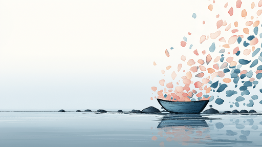 WonderMuralNosso super tapete ilustra um pacífico barco em uma superfície de água calma, cercado por pedras, enquanto pétalas coloridas escapam suavemente par...