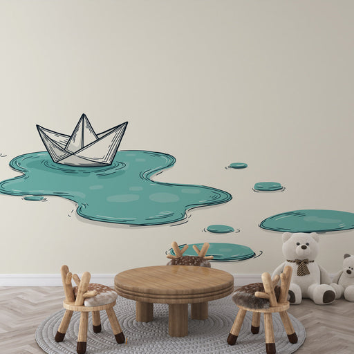 WonderMuralEste papel de parede mural destaca um delicadamente ilustrado barco de papel navegando em ondas suavemente rolantes, onde tons de azul se misturam ...