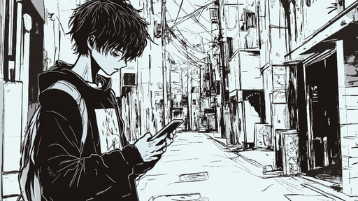 WonderMuralNosso Papel de parede apresenta uma ilustração de estilo mangá de um jovem parado em um beco urbano, absorto em seu telefone. O intenso preto e bra...