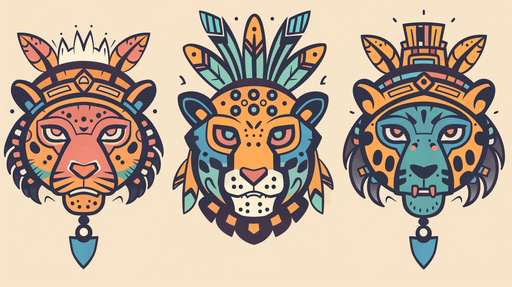 Ver todos os detalhesPapel de parede étnico asteca | Três cabeças de jaguar em fundo bege
