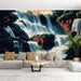 Este papel de parede mural evoca uma cena relaxante de cachoeiras cercadas por vegetação densa e rochas coloridas. As cascatas cintilantes criam uma atmosfera serena, enquanto os tons de azul e verde se harmonizam com toques de vermelho para um efeito visual cativante.