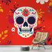 Este mural dinâmico apresenta um grande crânio no estilo calavera, lindamente decorado com padrões florais coloridos em um fundo vermelho brilhante. Os detalhes de cada flor e folha adicionam textura rica e caráter vibrante ao todo, tornando este design uma escolha ousada e festiva.